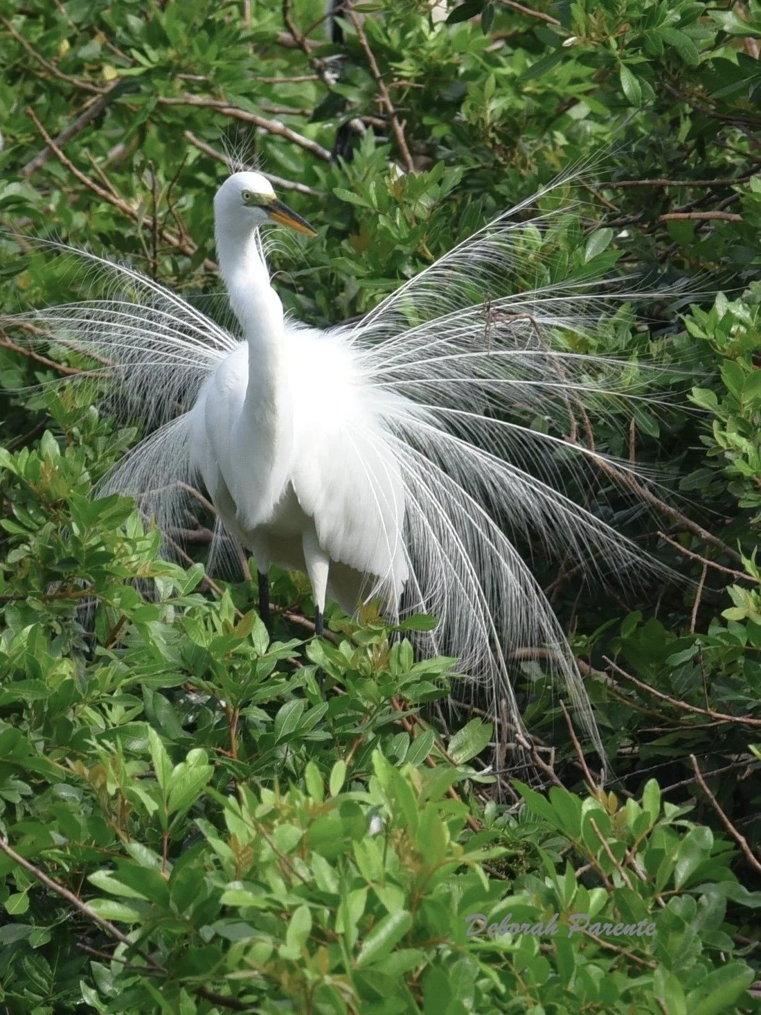 This Great Egret is in full breeding plumage, used in courtship displays. I found this particular one in a Southwest Florida rookery. The band across the eyes which is generally yellow is green during the breeding season. This is another wading bird that can even be found around Lake Champlain.
