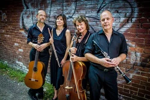 FREVO plays an eclectic sampling of chamber music for flute, clarinet, and cello and classical guitar including original arrangements and music from Jazz, Latin, Classical and the newly composed. The quartet features an exciting mix of music with the talents of Bonnie Thurber Klimowski on cello, Steven Klimowski on clarinet, Wendy Greenwald Matthews on flute, and Peter Matthew on guitar. Flutist Wendy Greenwald Matthews has performed with the Cleveland Composer’s Consortium, Warebrook Music Festival, Northern Winds and various orchestras and chamber ensembles. Classical guitarist Peter Matthews is involved in solo and chamber music work with VCME, Vermont Virtuosi, vocal group Counterpoint, and was a prize winner in the Stroud Competition. He and his wife, Wendy, have appeared on Innova and Albany records. Cellist, Bonnie Thurber Klimowski played for the State of Mexico Symphony